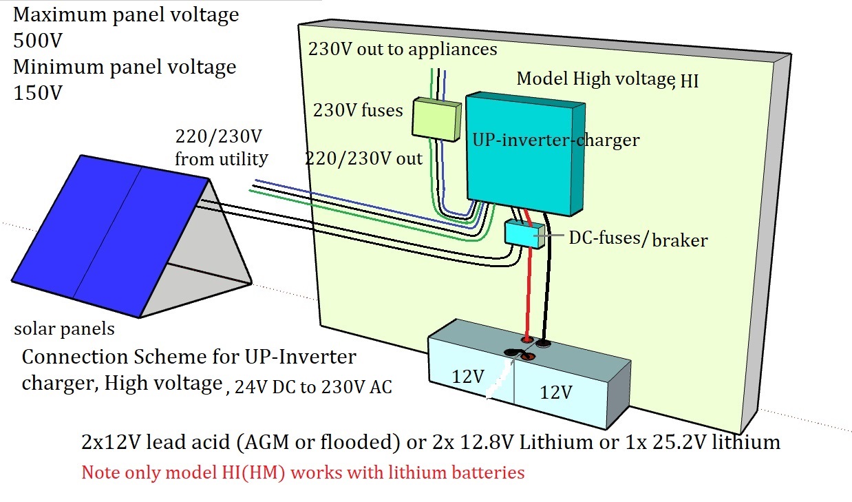 Observera att utmatningen inte kan ansluts till nätet utan inmatning kan anslutas till nätet för laddning av batterierna. Du har flera alternativ att ladda batterierna från, enbart från solceller, enbart från 230V nätet (eller egen generator) eller kombinerad nät- och solcellsladdning. För dig som har tillgång till elnät kan välja att utmatning kommer från nätet och låta batterierna stå uppladdade för tider det blir strömavbrott eller köra utmatning från batterier.