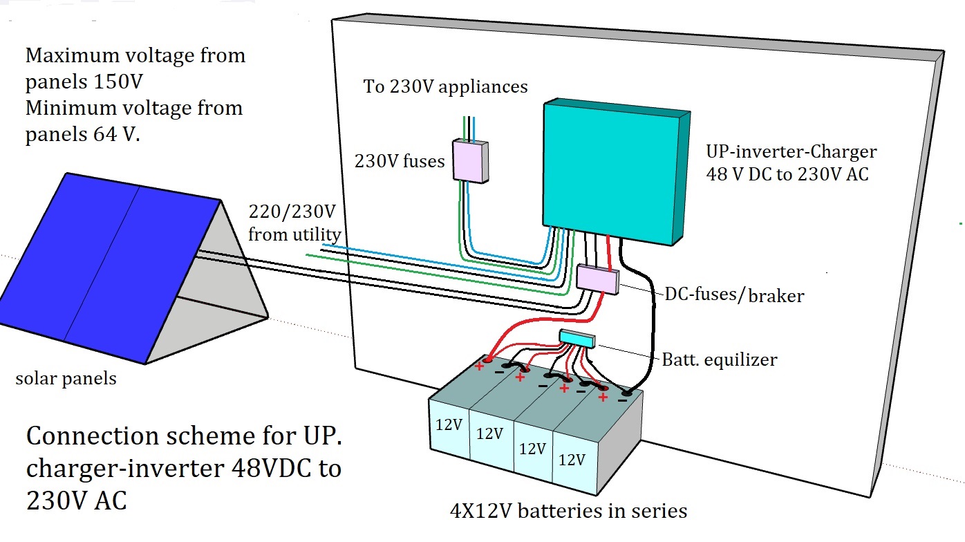 Observera att utmatningen inte kan ansluts till nätet utan inmatning kan anslutas till nätet för laddning av batterierna. Du har flera alternativ att ladda batterierna från, enbart från solceller, enbart från 230V nätet (eller egen generator) eller kombinerad nät- och solcellsladdning. För dig som har tillgång till elnät kan välja att utmatning kommer från nätet och låta batterierna stå uppladdade för tider det blir strömavbrott eller köra utmatning från batterier.
