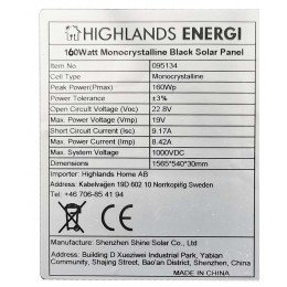 160W hög effektiv solcellspanel av Shine serie för maximal effekt på minimal yta. Panelen är helt svart. Shine serien finns i 4 storlekar från 100W till 160W. Alla har samma bredd. Kraftig anodiserad aluminium ram och behandlat svart.