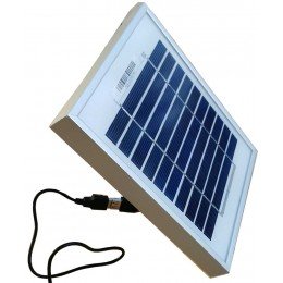 En 3W, 5V solcell för laddning av mobiltelefoner och andra USB-prylar. Laddar med över 600 mA, Kraftig aluminium ram med inbyggd , fällbar ställning för snabbt vinkling och placering i solen.